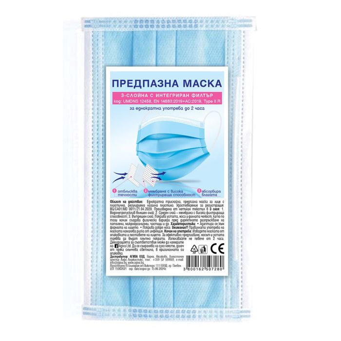 Област на действие: Еднократна, предпазна маска с пластична, регулируема назална пластина. Произведена от нетъкан текстил в 3 слоя: 1-Водонепропусклив външен слой; 2-среден слой- филтър от хидрофилен полипропилен с висока филтрираща способност; 3- хипоалергенен вътрешен слой;