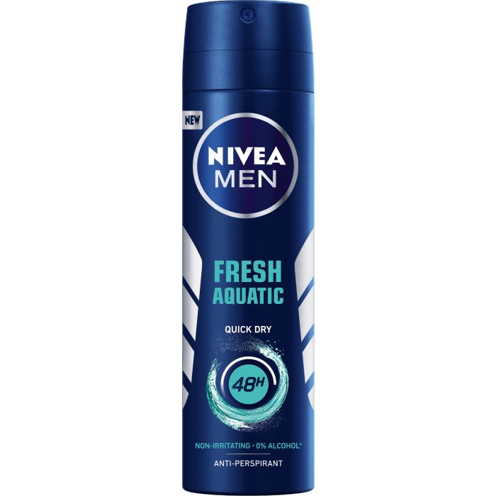 Новият антиперспирант спрей NIVEA Fresh Aquatic ти предлага интензивна и дълготрайна свежест. Формулата му предлага ефективна защита от неприятни миризми и изпотяване - до 48 часа съчетана с грижа за подмишниците ти! Бързото му съхнене, след прилагане, ти дава възможност да започнеш деня си по най-добрия начин. Продуктът не съдържа етилов алкохол, за максимална грижа и предпазване на кожата ти. Дерматологично одобрен.