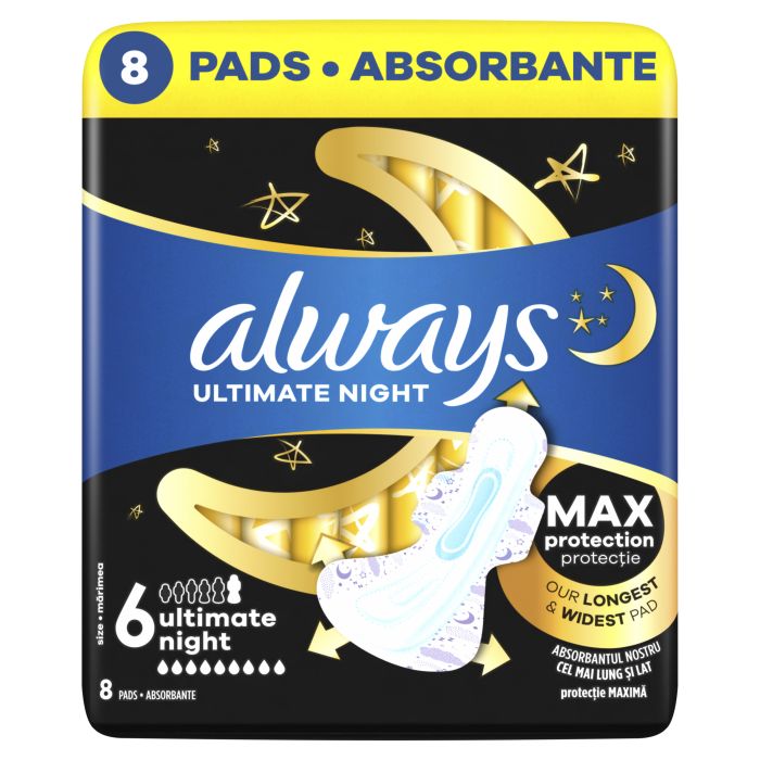 Не се задоволявайте с малко, получете 3 пъти по-добра защита с Always: Хигиеничните дамски превръзки Always Ultra Ultimate Night (размер 6), с крилца, използват най-нова технология, създаваща мултифункционална дамска превръзка с 3 защитни функции. Задната част на превръзката е с 60% по-широка от тази на превръзките Ultra Normal (размер 1), за допълнителна защита през нощта. Системата InstantDry попива течността за няколко секунди и държи влагата далече от кожата. Технологията LeakGuard улавя течността и помага за предотвратяване на протичанията. Освен това разполага с технологията OdourLock, която неутрализира миризмите, така че да се чувствате свежи и чисти по време на менструация. С Always Ultra можете да се чувствате уверени през цялата нощ. С дерматологично одобрение от Алианса за здраве на кожата. Отрийте перфектния модел с Always My Fit, персонализирана система за оразмеряване, която Ви помага да намерите най-добрата защита Always, според цикъла и размера на бельото Ви.