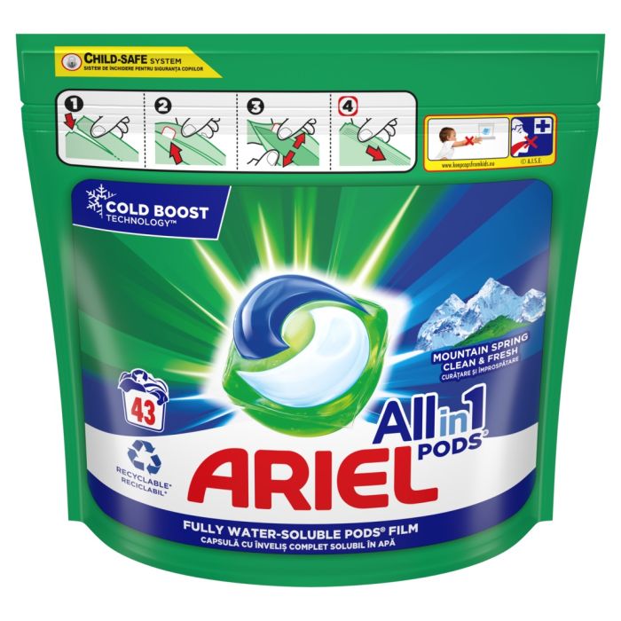 АРИЕЛ КАПСУЛИ ПЛАНИНСКА ПРОЛЕТ Гел капсули за пране представляват перилен препарат, специално създаден с отлични почистващи качества, осигуряващ дълготрайна свежест и безупречна чистота на тъканите. Изключително малките по размер, но силно концентрирани капсули гарантират мощно изпиращо действие дори и при най-упорити замърсявания, формулата на гела прониква във влакната и премахва петната, като запазва цветовете на тъканите ярки и наситени. Ariel 3in1 pods са бързо действащ препарат, което го прави подходящ и за кратък цикъл на пране, с който ще спестите вода и енергия. Уникалният дизайн на капсулата раздела трите различни формули за пране, а иновативният им слой се разтваря напълно при контакт с вода и освобождава мощната им почистваща сила, която се бори с трудни за отстраняване петна и миризми, благодарение на правилното дозираното количество детергент. Ariel 3in1 Pods Mountain Spring Гел капсули са удобни и практични за употреба, не изискват дозиране, лесно се съхраняват и дават отлични резултати дори при при 30 °C.