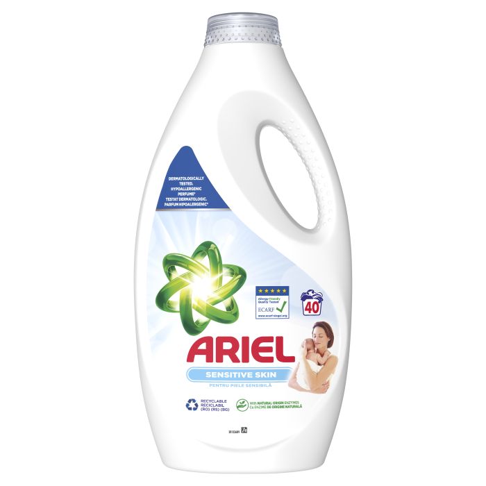 Благодарение на деликатната си формула, перилният препарат за чувствителна кожа Ariel Sensitive Skin е идеалното решение за почистване на дрехите в дълбочина, ако имате чувствителна кожа. Дерматологично тестваната и одобрена от ECARF (Европейски център за алергологични изследвания) формула съдържа 0% оцветители и е с хипоалергенен аромат, създаден за намаляване на алергичните реакции. За да осигури най-добрата защита на Ariel, формулата запазва деликатността на дрехите, които са в контакт с нежната кожа. Въпреки деликатното си действие спрямо кожата, Ariel е безкомпромисен към петната: Течният перилен препарат Ariel Sensitive Clean & Fresh осигурява на дрехите Ви изключителна чистота, дори при пране със студена вода. В допълнение, течният перилен препарат Ariel съдържа ензими от естествен произход и се предлага в рециклируеми опаковки. За оптимални резултати поставете дозиращата капачка с перилния препарат в барабана на пералната машина. Поради съображения, свързани с околната среда, не всички опаковки са снабдени с мерителна капачка; тя се предлага безплатно на сайта ariel.info.