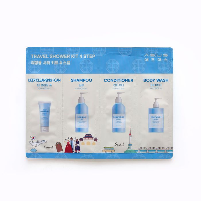 AS:US TRAVEL SHOWER KIT 4 STEP Дълбокопочистваща пяна за лице 5мл., Шампоан 5мл.,Балсам 5мл., Душ гел 5мл.