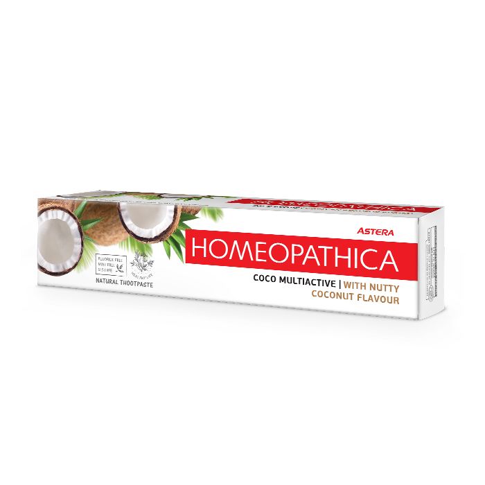 Комплексна грижа за зъбите и венците,със специална система от професионална силика и почистващ бустер, които гарантират много добро почистване при ниска абразивност на пастата. Подходяща за цялото семейство, с комплексна грижа за зъбите и венците. Тази специална паста за зъби е с изключително мек пенител, получен от ядката на кокосовия орех и е с нежен вкус на кокосово мляко! Серия продукти за устна хигиена ASTERA HOMEOPATHICA- алтернативна грижа без флуор, без мента, без SLS (Sodium Lauryl Sulfate), без парабени, без захар и без консерванти. Изключително подходяща за хора, стремящи се към здравословен, природосъобразен начин на живот и такива, провеждащи хомеопатично лечение. Продуктите са подходящи и при алергия към ментола. Всички пасти съдържат ксилитол за профилактика на кариеса. Ксилитолът е природен продукт, който може да бъде открит в много плодове и зеленчуци (малина, ягода, сливи и др.) и намалява риска от кариес на зъбите. Явява се важно средство в профилактиката срещу възпалението на венците и съдейства за реминерализацията на зъбния емайл. ASTERA HOMEOPATHICA подкрепя здравословната грижа и предлага натурални продукти за деца и възрастни.