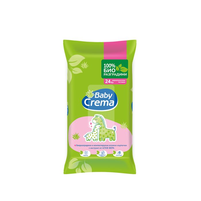 Нови Биоразградими влажни кърпички Baby Crema, вдъхновени от природата и създадени с грижа към нея. Екологично иновативен продукт, предлага вискозна тъкан от ново поколение с подобрена здравина и мекота. Естествените влакна се обработват гладко и генерират високоефективна кърпичка. Произвежда се, като оставя 14% по-малък въглероден отпечатък в сравнение с обикновената вискоза. Освен това, когато я изхвърлите, тя се връща в природата по-бързо от обикновената вискоза благодарение на структурата на свързване на влакната. Предлагат се в компактна опаковка от 24 бр. – идеални за разходки и пътувания. Кърпичките са с неутрална почистваща формула, която е безопасна дори за най-чувствителната бебешка кожа. Съдържат натурален екстракт от алое вера и пантенол, които хирадират, омекотяват и успокояват кожата, като я предпазват от раздразнения и подсичане. Вискозната тъкан от ново поколение, попива по-добре и улеснява почистването само с едно движение.