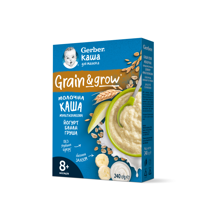 GERBER Млечна каша овес, пшеница, йогурт, банан, круша 8+м, 240г
