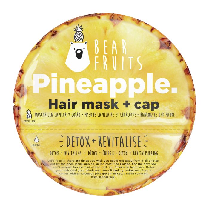 Поглезете се с новата маска с екстракт от ананас от BEAR FRUITS, която има детоксикиращо и ревитализиращо действие върху косата. За да подейства, поставете върху косата си веселата шапка Ананас и се отдайте на забавления. А най-хубавото е, че може да запазите и да използвате шапката всеки път, когато имате нужда от щура атмосфера в банята!