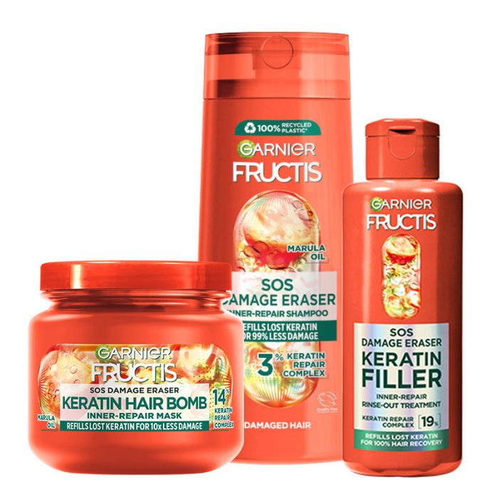 Garnier Fructis SOS Repair маска за увредена коса. Garnier Fructis SOS Repair маска за увредена коса, възтъновява едногодишни увреждания на косата.Формулата е обогатена с 13% обновяващ комплекс с растителен кератин и маслен екстракт от амла, за интензивно обновена, по-силна и блестяща коса.