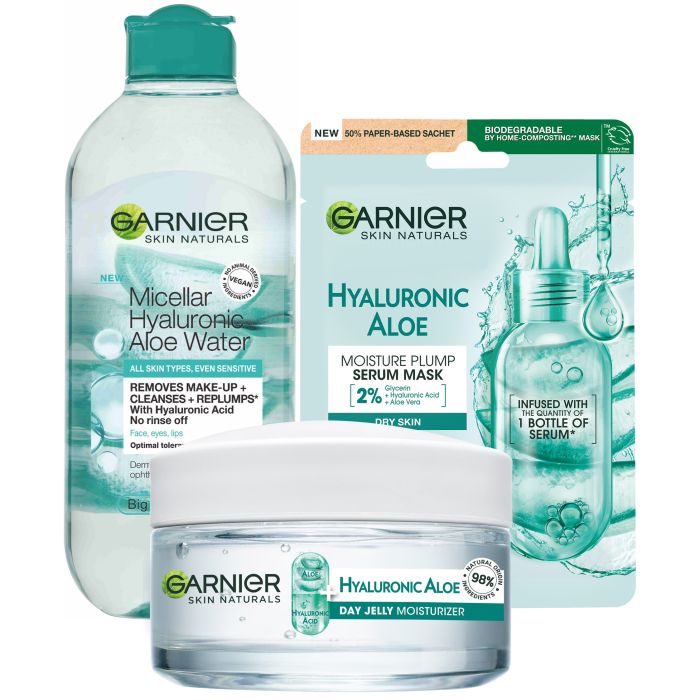 HYALURONIC ALOE Мицеларна вода. Нежен и ефикасен начин да отстраните грима, да почистите кожата и да върнете обема*, само с едно движение, без отмиване. Обогатена с хиалуронова киселина, която чрез хидратация възстановява обема на кожата и блясъка, без изсушаване, и с мицели, които привличат и отстраняват грима и нечистотиите от кожата. Подходяща за всички типове кожа, дори и чувствителна. Този флакон съдържа 20% рециклирана пластмаса, с което се спестяват 270 тона нова пластмаса годишно**. *Чрез хидратация. **Въз основа на данни от 2018 година.