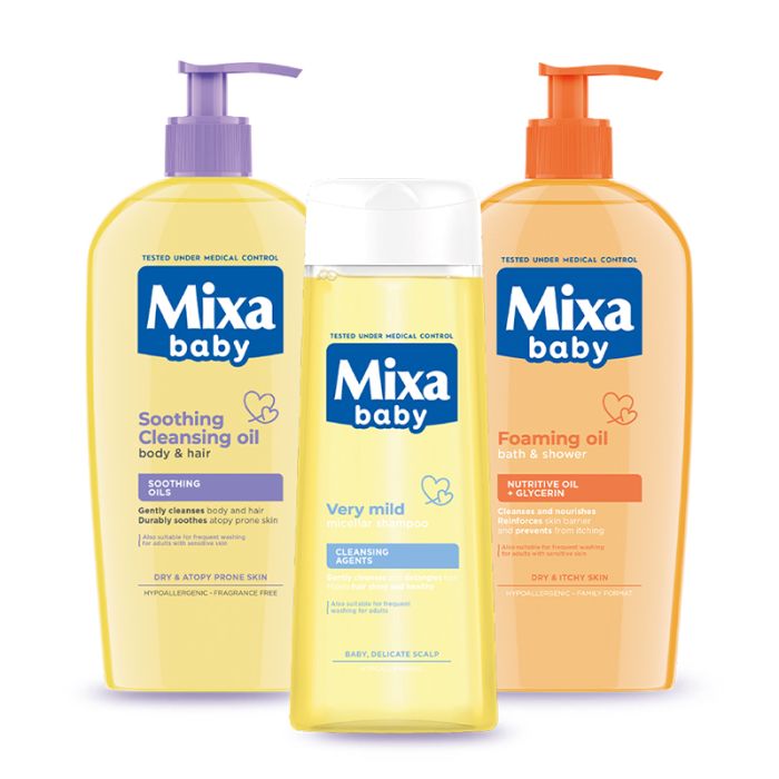 Успокояващо душ олио за къпане за суха кожа и кожа, склонна към атопия. MIXA създаде успокояващо хипоалергенно олио за къпане, пред- назначено специално за бебета – ATOPIANCE, което бързо и дълготрайно успокоява сухата и чувствителна кожа