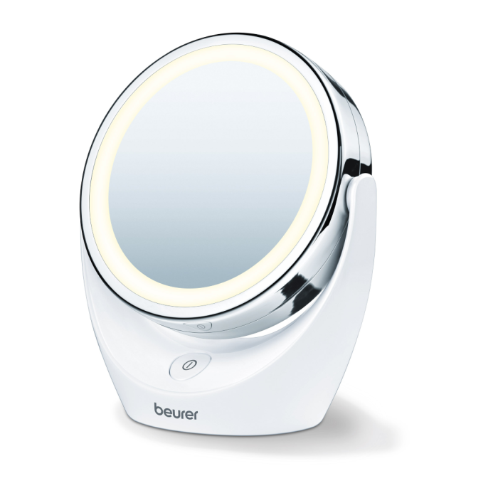 Beurer Cosmetic Mirror представлява козметично огледало с led осветление, което разполага с две страни с нормално отражение и с 5-кратно увеличение. Въртящото се огледало е с диаметър 11 см. което го прави изключително удобно и практично. Благодарение на 5-кратното си увеличение и Led осветението, Вие може да видите лицето си и в най-малките детайли. Меката Led подсветка е снабдена с 12 светодиода, които се захранват от 3 броя батерии по 1.5V за още по-качествено отражение. Огледалото е изработено от олекотена пластмаса с хронирани елементи. Красивото огледало е безценен помощник за създаване на красивата Ви и безупречна визия. Гаранция 36 месеца.