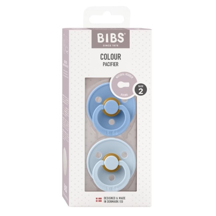 Емблематичните биберони BIBS са произведени в Дания и от там идва тeхният иновативен дизайн. През последните 40 години BIBS са се установили като едни от най-популярните, изработени от 100% естествени материали, биберони в световен мащаб. Известни в цял свят с невероятните си цветове, безупречно качество и функционалност. BIBS Colour са залъгалки от естествен каучук, с кръгла форма на зърното, която наподобява майчината гърда, за да може децата да се чувстват естествено. Те са специално разработени за успокояване на бебето като в същото време поддържат и стимулират естествения инстинкт на всяко бебе от сукане. Биберонът е изработен от 100% естествен каучук, без вредни добавки, който е издръжлив, еластичен и мек като кадифе. Щитът представлява полипропилен (PP), който е здрав и лек. Формата и материалът на щита, от които е изработен всеки един биберон BIBS, улесняват бебето да го изтласква с лекота от лицето и не дразнят нежната бебешка кожа. Той е леко извит навън, с въздушни отвори и защитна дръжка за по-голяма сигурност. Комплектът включва: 1 x Sky Blue Размер 2 и 1 х Baby Blue Размер 2 (6-18 месеца) Кръгло зърно: Предлага се в естествен каучуков латекс. Препоръчва се от акушерките за подпомагане на естественото кърмене. Кръглото зърно насърчава подобно разположение на езика и техника на сукане като при кърмене, тъй като кръглата форма позволява на страните на езика да се повдигат и да се обгръщат около зърното, точно както се случва по време на кърмене. Зърното е снабдено с клапа, изпускаща въздух, когато бебето затвори зърното. Тази вентилационна система кара въздуха от вътрешността на зърното да бъде изтласкан през клапата, като по този начин сплесква зърното, за да се оформи естествено като устната кухина на бебето. Вентилът е и причината, поради която водата може да се появи в зърното след почистване и стерилизация. Ако случаят е такъв, просто стиснете зърното, за да изтласкате излишната вода. Информация за щита: Кръглият лек щит е обърнат настрани от чувствителната и деликатна кожа около устата на бебето, за да осигури минимален контакт с носа и устата, което означава по-малък шанс за натрупване на влага от слюнката, което може да причини обриви и възпалени петна. Щитът се предлага в един размер, независимо от размера на зърното. Изработен е от 100% безопасен материал.