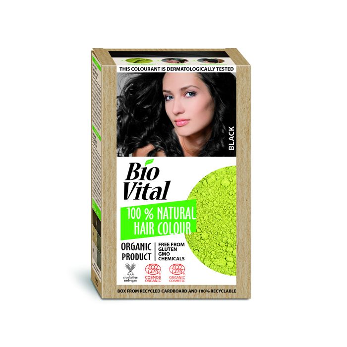 Bio Vital е 100% натурална боя за коса за хора, които искат да заменят боядисването на коса със синтетични багрила. Bio Vital е 100% органична и не съдържа никакви парабени и консерванти, както и амоняк, пероксид, парафенилендиамин или други обичайно срещани съставки в синтетичните бои за коса. Съставките в този продукт са с натурален произход от Индия и са специално подбрани, за да дадат най-добрия цвят на вашата коса. Винаги си правете предварителен тест за цвят с кичур от вашата коса. Как работят натуралните бои: Растенията, които са във формулите на тези бои, покриват външния слой на косъма, като по този начин подчертават неговия цвят. Натуралните бои за коса не изсветляват косъма. Затова препоръчваме да избирате натурални бои за коса с цвят близък до сегашния ви. Важно: Ако искате да преминете на синтетична боя за коса или да изсветлите косата си след като вече сте се боядисали с натурална боя за коса, трябва да изчакате тя да се отмие напълно (около 4 седмици), за да може да продължите с другия продукт.