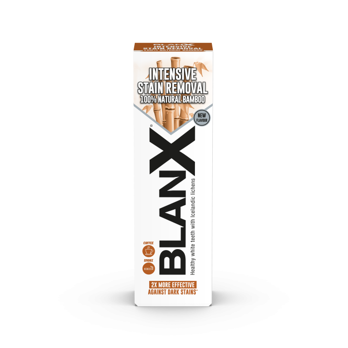 • Благодарение на действието против петна на 100% натурални екстракти от бамбук, BlanX® Intensive Stain Removal е 2 пъти по-ефективен срещу тъмни петна*.