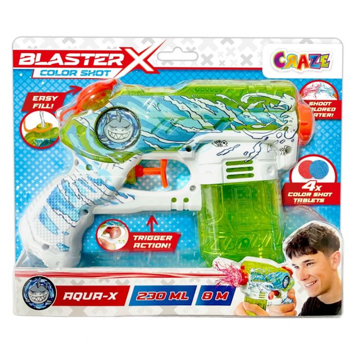 BLASTER-X Small е компактен (20 см), с бързо пълнене, обхват до 8 м и 230 мл резервоар. Включва 4 цветни таблетки за пръски в синьо и червено.