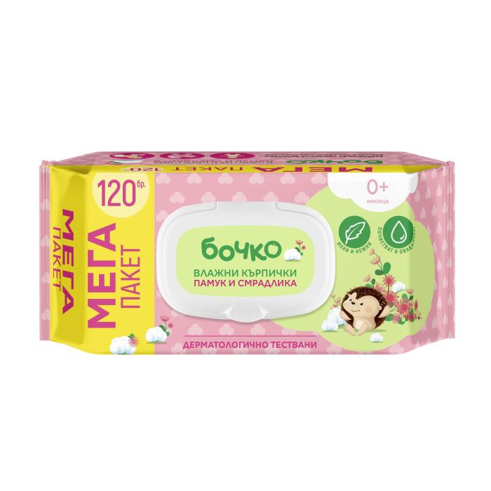 БОЧКО Влажни кърпички Памук и смрадлика капак 120 бр.