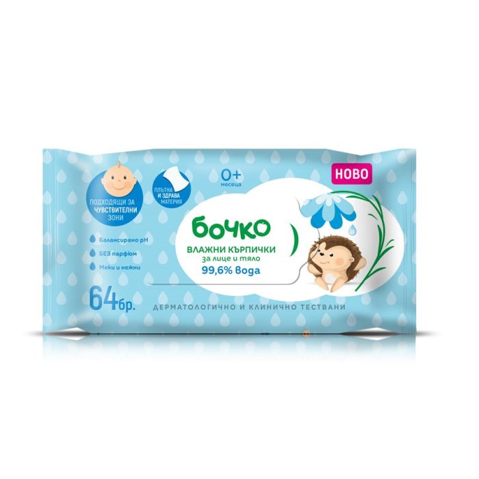 Бочко влажни кърпички за лице и тяло 99,6% вода са създадени за ежедневна грижа и тоалет на деликатната бебешка кожа от първия ден. Подходящи за почистване и освежаване на най-нежните и чувствителни зони на бебето - очи, носле, устни и областта на пелените. Изработени с естествени материали с грижа към природата. Произведени по специална технология, осигуряваща здравина, плътност и минимална разтегливост при употреба. Навлажнени с лосион, съдържащ 99,6% пречистена вода, с балансирано рН и без парфюм. Меките кърпички Бочко са дерматологично и клинично тествани, без дразнещо действие.