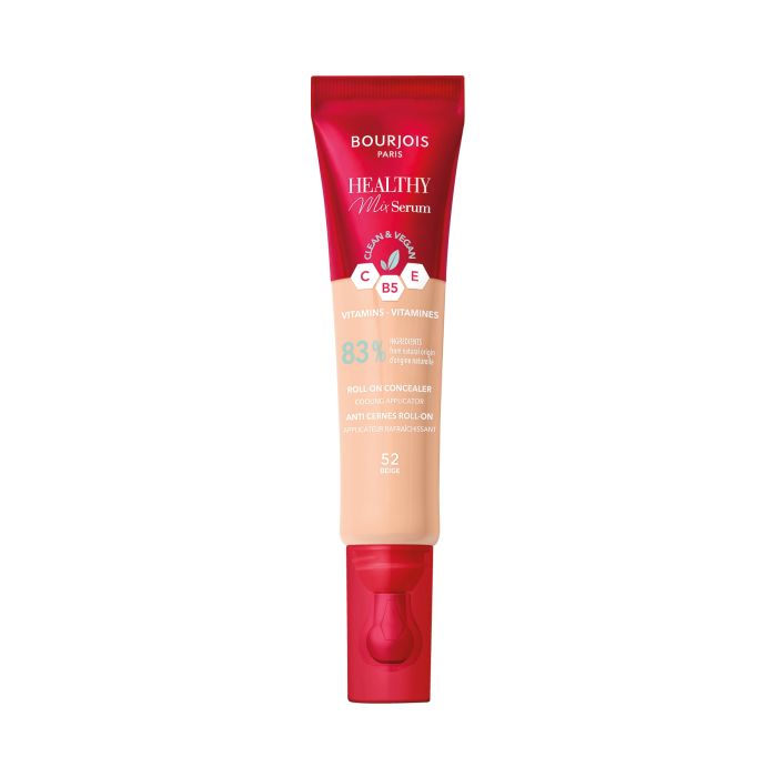 Покритието на коректор, съчетано със силата на серум за очи, прикрива признаците на умора и осигурява сияен тен!Формула с кофеин, който помага за изглаждане на зоната под очите, и интензивни пигменти за незабавен ефект против умора. С 84% съставки от естествен произход, като съставът включва и характерния за Bourjois Healthy Mix витаминен комплекс C, E и B5, които помагат за хидратиране и защита на кожата под очите.Благодарение на roll-on накрайника има охлаждещ ефект.