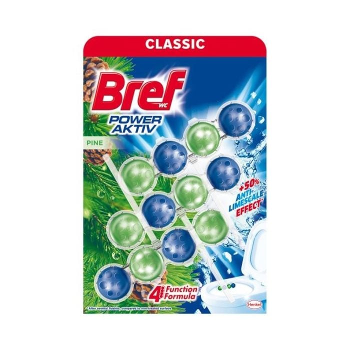 Bref Power Aktiv има фантастична нова формула с четири функции, която включва хигиена, мощна пяна, анти-калц сила и изключителна свежест, съчетавайки постоянна хигиенична чистота на тоалетната и фантастичен боров аромат, който продължава седмици.
