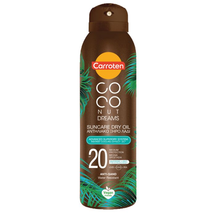 Слънцезащитното сухо олио Coconut Dreams SPF20 е обогатено със системата Superdry за бързо попиване и уникално мека кожа без остатъчен мазен ефект. Интензивната система за тен с морков и кокосово олио ускорява придобиването на тен, като придвава на кожата дълготраен и сияен слънчев загар. С тройна система за слънчева защита от UVA, UVB + IRA лъчите. Оставя кожата освежена и предлага 360° система за пръскане за лесно нанасяне от всички ъгли.