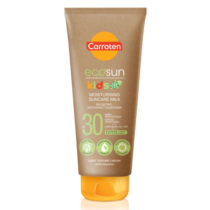 CARROTEN Ecosun Kids хидратиращо слънцезащитено мляко SPF30 има висока степен на защита и осигурява подобрена 4-степенна защита на кожата, насочена към най-широкия спектър от всички слънчеви лъчи (UVB+UVA+VL*+IRA*).
