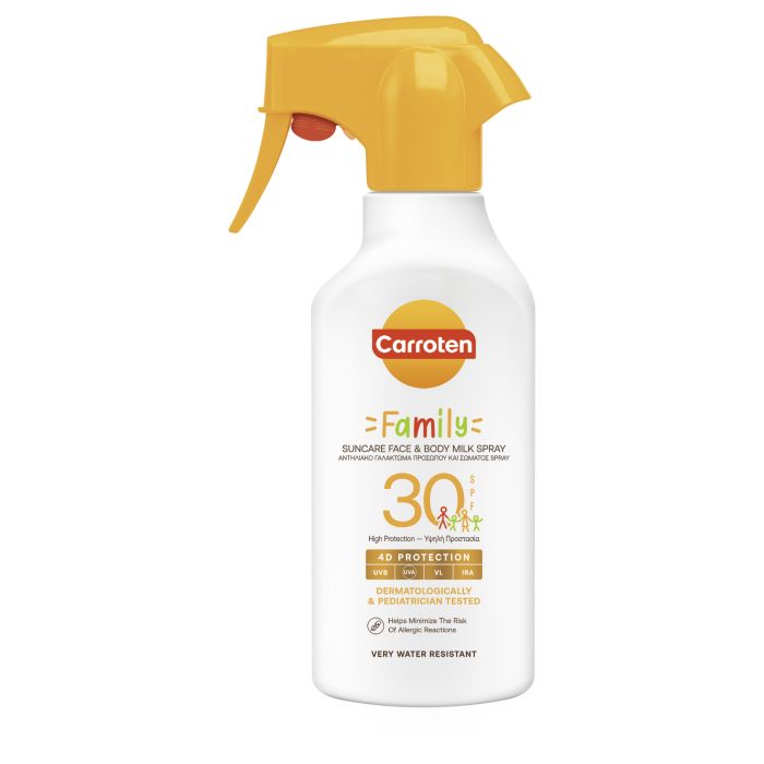 Слънцезащитното мляко спрей Family SPF30 предлага лесно нанасяне и осигурява усилена защита за кожата от най-широкия спектър от всички слънчеви лъчи. Специално създаден за възрастни и деца, неговата формула е обогатена с успокояващи съставки, които осигуряват дълготрайна грижа за деликатната кожа. Леката, неомазняваща формула се абсорабира бързо от кожата и й придава уникална мекота и оптимална хидратация.