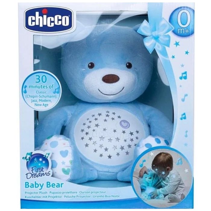 Куклата Chicco Baby Bear е оборудвана с 3 светлинни ефекта за различни нива на релаксация: нощна прожекция с магическа атмосфера; релаксираща мека проекция; нощна лампа за успокоение на детето