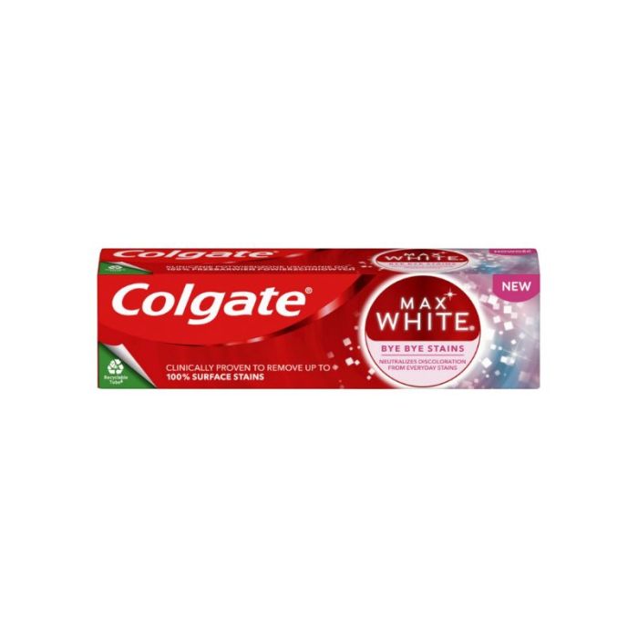 Избелващата паста за зъби Colgate Max White Bye Bye Stains е клинично доказано, че премахва до 100% от повърхностните петна* за по-бяла усмивка. Тази паста за зъби за премахване на петна помага за намаляване на плаката с редовно четкане, като помага да поддържате емайла си силен и много здрав. Вземете 1 нюанс по-бели зъби само за 1 седмица* с Max White Bye Bye Stains от Colgate.