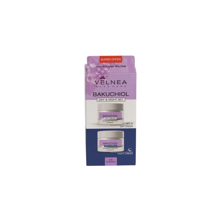 Комплектът VELNEA BAKUCHIOL съдържа дневен и нощен крем, предназначен за ежедневна грижа против стареене на кожата.