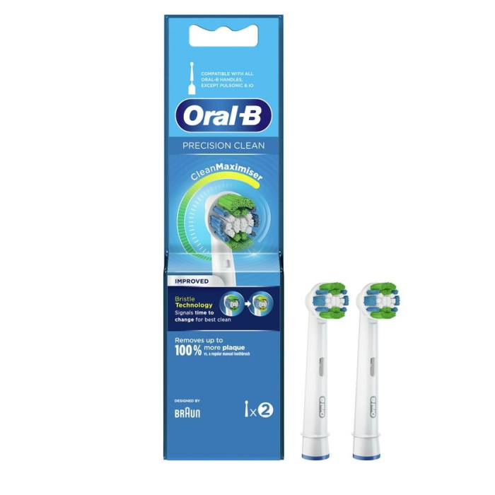 Накрайниците за електрическа четка за зъби Oral-B Precision Clean имат прецизни ъгли, благодарение на които бактериалната плака се изчиства по-успешно. Премахват до 100% повече плака и замърсявания от ръчна четка за зъби. Влакната на Oral-B Precision Clean Накрайници за електрическа четка за зъби са разработенис технологията Clean Maximizer, която променя цвета на зелените влакна в жълти в края на живота им, за отлично почистване и оптимални резултати на главите за четки.Те достигат до труднодостъпните междузъбни пространства и почистват прецизно и ефективно устната кухина. Стоматолозите препоръчват накрайниците да се сменят на всеки три месеца. Тези глави са съвместими с всички дръжки Oral-B с изключение на Pulsonic & iO. Предлагат се в опаковка от 2 броя