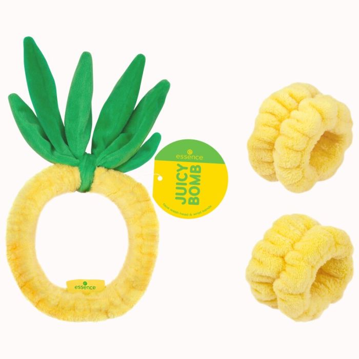 Внесете тропически обрат в рутината си за грижа за кожата с лентата за глава и лентите за китки на essence JUICY BOMB Party 01 Pineapple Party. Този комплект „2 в 1“ включва мека, еластична лента за глава с дизайн на ананас, която да държи косата ви далеч от лицето, и чифт ленти за китки, за да предотврати капенето на вода по ръцете ви. Перфектни за всички, които обичат практичните инструменти за красота, тези яркожълти аксесоари правят рутината ви лесна, забавна и безпроблемна. Независимо дали миете лицето си или нанасяте грим, този весел комплект добавя сочен поп стил към вашата рутина за красота!