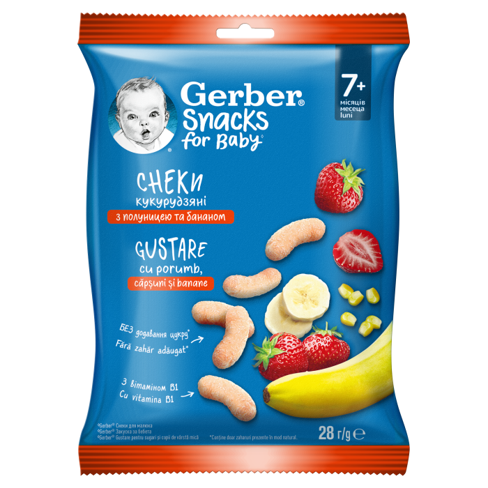 GERBER Царевичен снакс с ягоди и банани 7+м, 28г