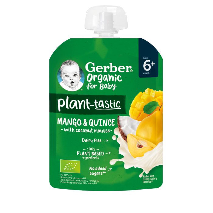 Паучът GERBER® Organic for baby Десерт Манго и Дюля с Кокосов мус за бебета от 6-ия месец.