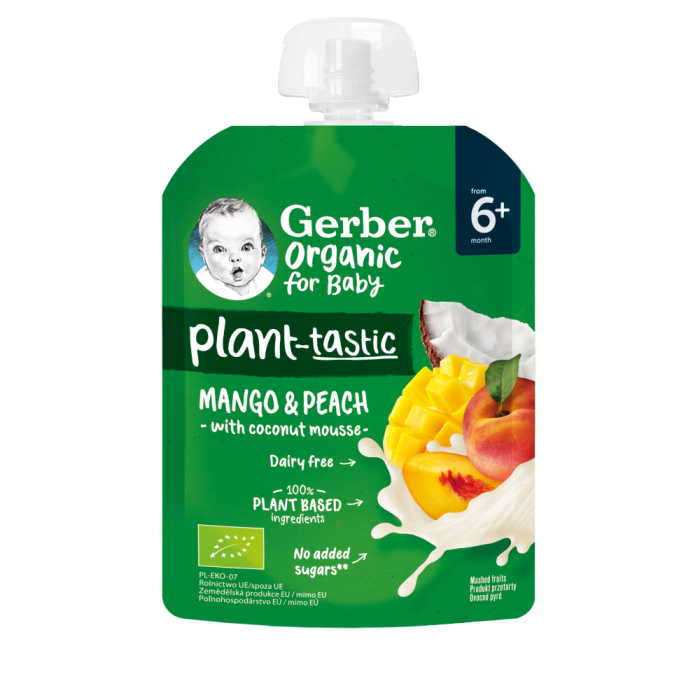 Паучът GERBER® Organic for baby Десерт Манго и Паскова с Кокосов мус за бебета от 6-ия месец.