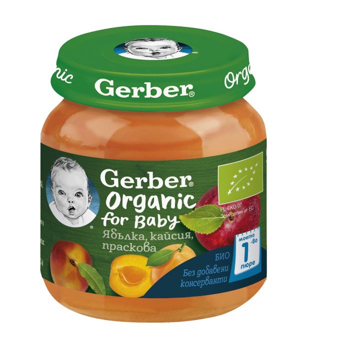 Gerber Organic for baby Ябълка, кайсия, праскова е био пюре предназначено за бебета от 6-ия месец. Вкусна комбинация от познати плодове, които идват директно от биологично земеделие, където се отглеждат с уважение към естествените процеси и грижа за околната среда. Всяка година биологичното им качество се сертифицира. Съставките са висококачествени и органични, без добавени оцветители, аромати, захар и сол.