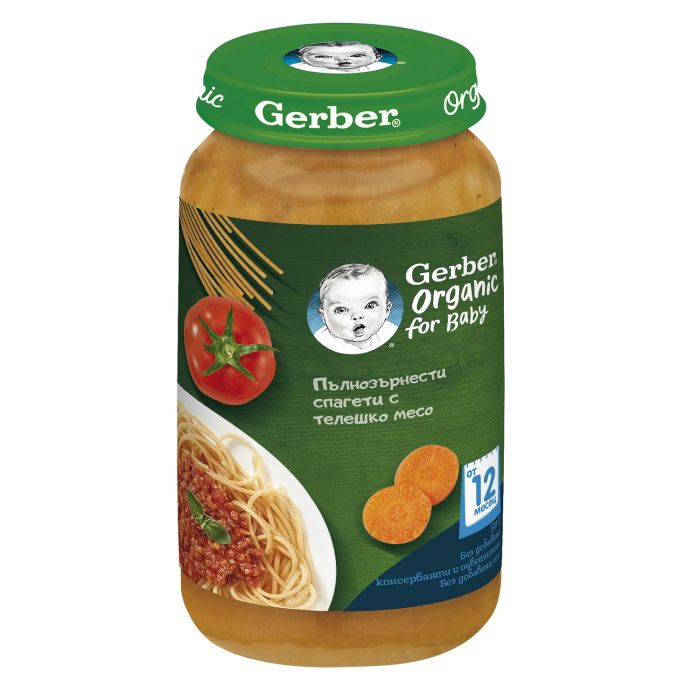 Gerber Organic for baby Пълнозърнести спагети с телешко месо е био пюре, предназначено за бебета от 12-ия месец. Продуктът е с подходяща за възрастта текстура, със ситно нарязани, меки парченца, подходящи за стимулиране на дъвкателните умения на бебето. Суровините в био пюрето Gerber идват директно от биологично земеделие, където се отглеждат с уважение към естествените процеси и грижа за околната среда. Всяка година биологичното им качество се сертифицира. Съставките са висококачествени и органични, без добавени оцветители, аромати, захар и сол.