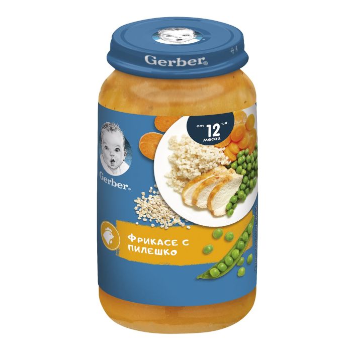 Пюрето Gerber Фрикасе с пилешко е предназначено за малки деца след 12-ия месец. Продуктът е с подходяща за възрастта консистенция, съдържаща по-големи твърди парченца, като се доближава до вкуса на храната за възрастни, но с високите изисквания и контрол, които се спазват при бебешките храни. Пюрето осигурява необходимите хранителни вещества белтъци, въглехидрати и мазнини и е походящо за деца, в чийто меню са въведени твърди храни. Съдържанието на богат микс от зеленчуци като моркови, зелен грах и лук както и ситно нарязан магданоз и копър обогатяват вкусовия свят на детето и допринасят за изграждането на здравословни хранителни навици. От друга страна комбинацията от пилешко месо и зеленчуци е чудесна, защото помага за изграждането на балансиранo меню на малкото дете. Съставките са естествени и висококачествени, без добавени оцветители и аромати. Съдържа ГЛУТЕН.