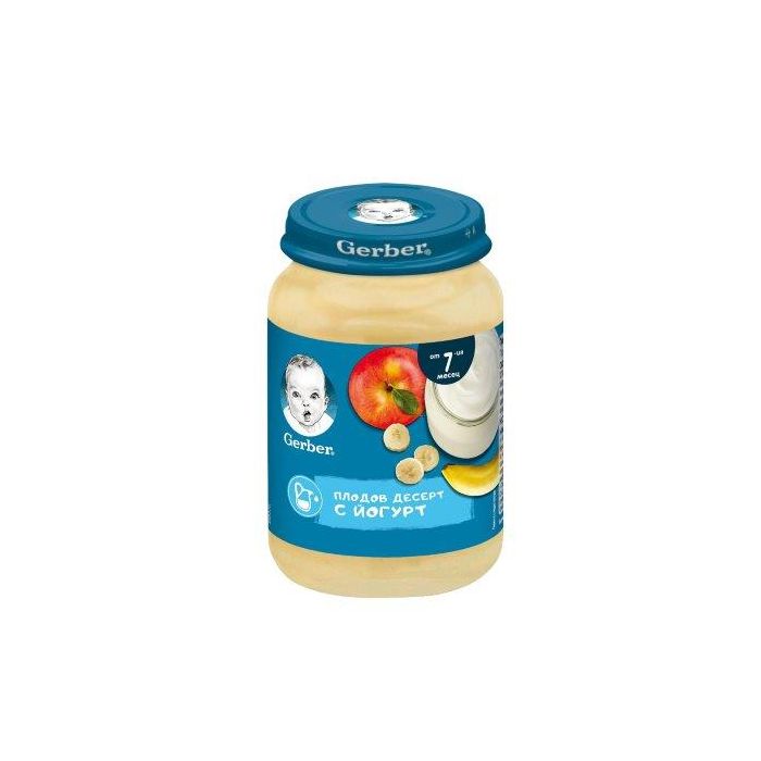 Бебешко пюре Gerber Плодов десерт с йогурт е предназначено за бебета след 7-ия месец. Продуктът е с подходяща за възрастта текстура, с малки намачкани частички, подходящи за стимулиране на дъвкателните умения на бебето. Пюрето представлява превъзходна комбинация от сок от бяло грозде и кисело мляко. Съдържанието на малки намачкани парченца ябълка и кайсии допринасят за изграждането на хранителни навици на детето чрез опитване на нови вкусови и текстури. Съставките са естествени и висококачествени, без добавени оцветители, аромати и захар.