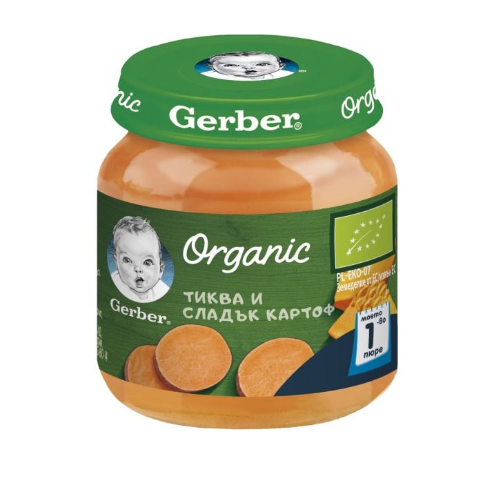 Пюрето Gerber Organic Тиква и сладък картоф представлява чудесна комбинация от висококачествени и органични продукти, без добавени оцветители , аромати, консерванти , захар и сол, която допринася за обогатяването на вкусовете и изграждането на полезни хранителни навици, благодарение на разнообразното и балансирано меню. Суровините в пюрето идват директно от биологично земеделие, където се отглеждат с уважение към естествените процеси и грижа за околната среда. Всяка година биологичното им качество се сертифицира. Този продукт може да се използва за захранване.