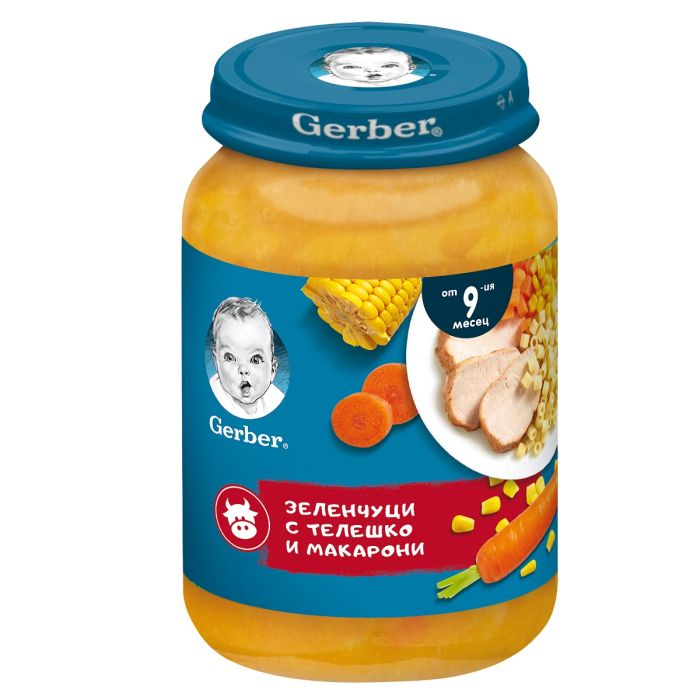 Пюрето Gerber Зеленчуци с телешко и макарони е предназначено за бебета след 9-ия месец. Продуктът е с подходяща за възрастта текстура, със ситно нарязани, меки парченца, подходящи за стимулиране на дъвкателните умения на бебето. Осигурява необходимите хранителни вещества белтъци, въглехидрати и мазнини. Пюрето представлява превъзходна комбинация от разнообразни зеленчуци, телешко месо и макарони. Съдържанието от моркови и ситно нарязан магданоз допринасят за изграждането на хранителни навици на детето чрез опитване на нови вкусови и текстури. Съставките са естествени и висококачествени, без добавени оцветители и аромати.