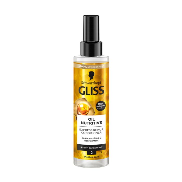 Спрей-балсамът Schwarzkopf Gliss Oil Nutritive има подхранващо и заглаждащо действие. Укрепва косъма от корените до върховете и придава блясък. Формулата, обогатена с олеинова киселина и масло от марула, има ефективно действие с видим ефект. Продуктът е подходящ за изтощена и третирана коса.