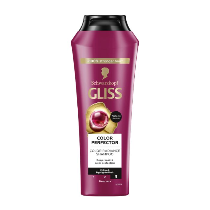Шампоан Gliss Colour Perfector с ХИАЛУРОНОВ КОМПЛЕКС + ЕКСТРАКТ ОТ ЧЕРВЕНА БОРОВИНКА за боядисана или коса на кичури. Дълбоко възстановяване