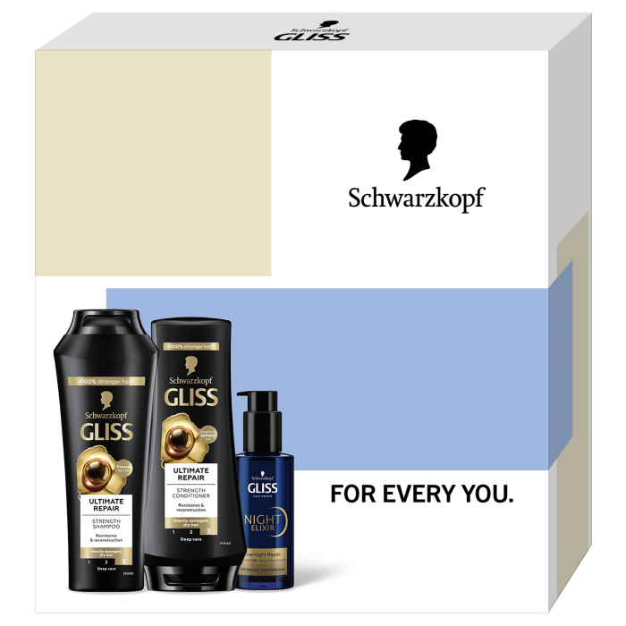 Балсам: Ако страдате от много увредена и суха коса, то балсамът за коса Gliss Ultimate Repair може да Ви помогне да се справите с тези проблеми и несъвършенства. Балсамът съдържа течен кератин и черни перли, които помагат за възстановяването на силно увредената коса. Действа също и за по-лесното разресване на косата, както и повече устойчивост при увреждане и допълнителен блясък.