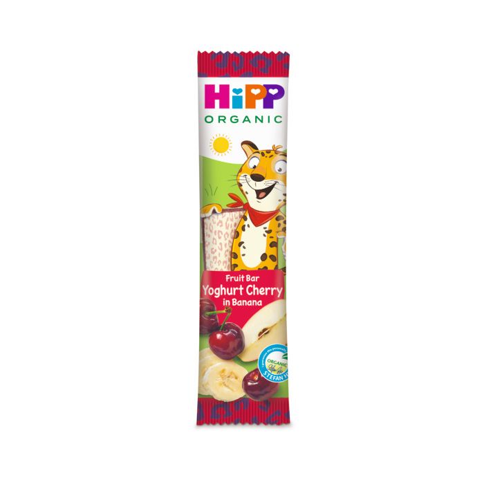 HIPP ХИП БИО плодов бар ЛЕОПАРД с йогурт, вишни и банани. Предназначен за лека закуска или десерт на деца над 1 година. Вкусен и здравословен. Идеален за леко хапване по време на път и разходка. Не съдържа изкуствени аромати, оцветители и овкусители. Без добавена захар.