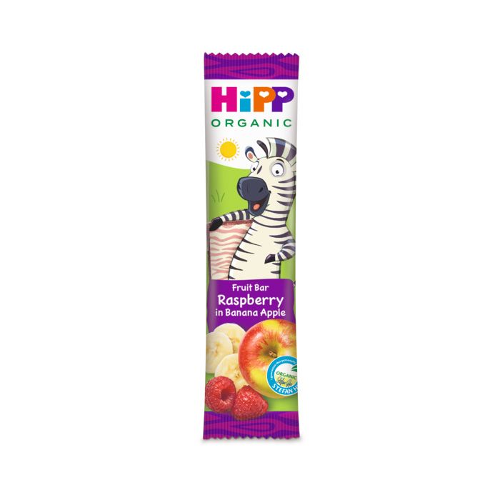 HIPP ХИП БИО суров бар ЗЕБРА с овес, малини, ябълки и банани. Предназначен за лека закуска или десерт на деца над 1 година. Вкусен и здравословен. Идеален за леко хапване по време на път и разходка. Не съдържа изкуствени аромати, оцветители и овкусители. Без добавена захар.