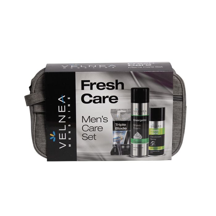 Комплект Velnea Men Care Fresh Care с несесер съдържа Velnea Men Fresh Care антиперспирант спрей 150 мл, Velnea Men Energetic пяна за бръснене 250 мл, Velnea Men еднократни самобръсначки с три остриета 4 броя и Velnea Men несесер. Velnea антиперспирант е ефективен, но и нежен, с 24 часа защита. Velnea пяната за бръснене съдържа богата кремообразна формула обогатена с екстракт от Гуарана, Пантенол и Витамин E, позволява гладко бръснене и осигурява освежаващ прилив на енергия за вашата кожа. Velnea еднократният самобръснач с три остриета осигурява ефективно и лесно бръснене. Velnea men несесер 25x15x9 см.