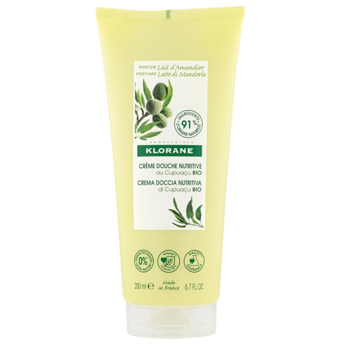 Душ-кремът с аромат мляко от бадем на Klorane нежно почиства и интензивно подхранва суха и много суха кожа. Кремообразната, луксозна формула предлага предимствата на маслото от органично купуасу, което е 1,5 пъти по-подхранващо от маслото от карите. Душ-кремът, богат на мастни киселини и силно подхранващи натурални активни съставки, позволява на кожата да задържа вода, осигурявайки ѝ еластичност и хидратация. Кожата е перфектно почистена и подхранена, обгърната от успокояващи нотки на фрезия, мляко от памук и плод от купуасу. Душ-кремът е нежен към кожата и околната среда, екологичен, с биоразградима* формула и с опаковка с еко дизайн, изработена от 40% по-малко пластмаса.