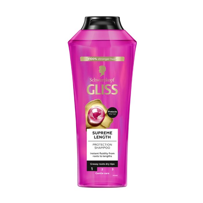 Шампоан Gliss SUPREME LENGTH с БИОТИНОВ КОМПЛЕКС и БОЖУР за дълга коса, склонна към увреждане и мазни корени. Моментално заглажда от корените до краищата и предпазва от накъсване.