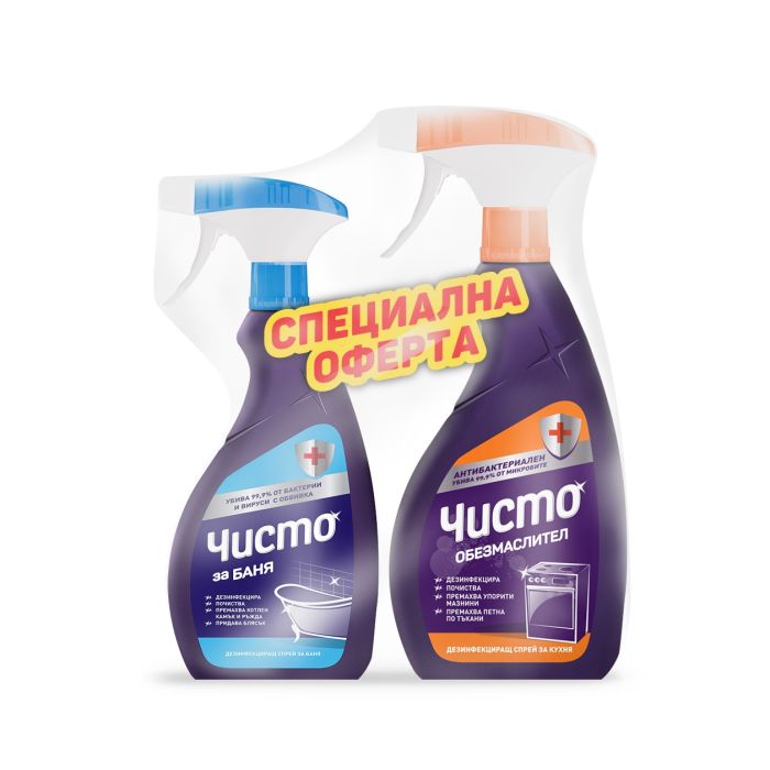 Обезмаслител: Биоцидът е дезинфектант с бактерицидно и фунгицидно действие. Идеално отстранява устойчиви мазни замърсявания върху различни водоустойчиви и алкалноустойчиви повърхности: кухненски шкафове, мивки, подове и оборудване - фурни, готварски печки, скари, фритюрници, абсорбатори, хладилници, мивки, предмети от пластмаса, метал, порцелан и стъкло в бита и в обекти за производство и търговия с храни, индустриални обекти и такива с обществено предназначение. Подходящ и за петна върху тъкани.За баня: Биоцидът е дезинфектант с бактерицидно, фунгицидно и ограничено вирусоцидно (вируси с обвивка) действие. Чисто за Баня с високоефективната си формула гарантира искряща чистота във вашата баня. Плътната и гъста пяна лесно се задържа върху вертикални повърхности и идеално отстранява упорити замърсявания като котлен камък, ръжда, петна от сапун и други върху вани, мивки, душ кабини, плочки и батерии. Предназначен за дезинфекция и почистване на киселинно-устойчиви повърхности (плочи, хромирани арматури, порцелан, благородна стомана, каучук). Не е подходящ за естествен камък (мрамор), алуминий, месинг, мед и емайли, чувствителни спрямо киселини. Оставя блестящи повърхности и свеж лимонов аромат. Улеснява последващо почистване.