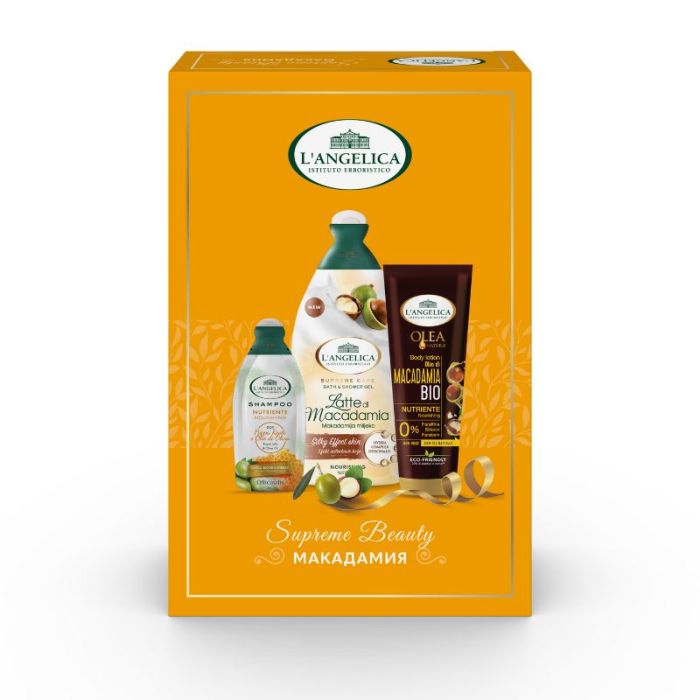 L'ANGELICA Комплект Душ гел и пяна за вана макадамия, 500 мл + Лосион за тяло, 250 мл + Шампоан, 10 мл