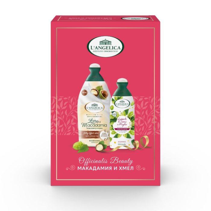 L'ANGELICA OFFICINALIS BEAUTY МАКАДАМИЯ И ХМЕЛ включва L'ANGELICA OFFICINALIS ДУШ-ГЕЛ/ПЯНА ЗА ВАНА С МАСЛО ОТ МАКАДАМИЯ 500 мл и L'ANGELICA OFFICINALIS ШАМПОАН УКРЕПВАЩ ЗА ЧЕСТА УПОТРЕБА С ХМЕЛ И ПРОСО 250 мл.